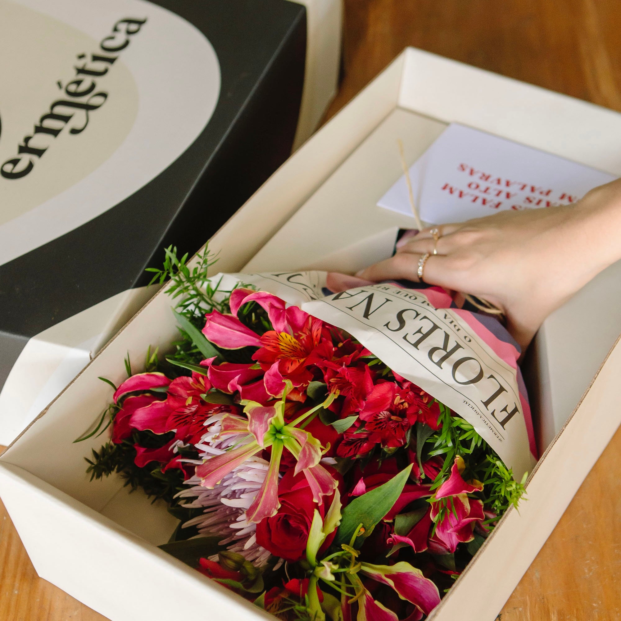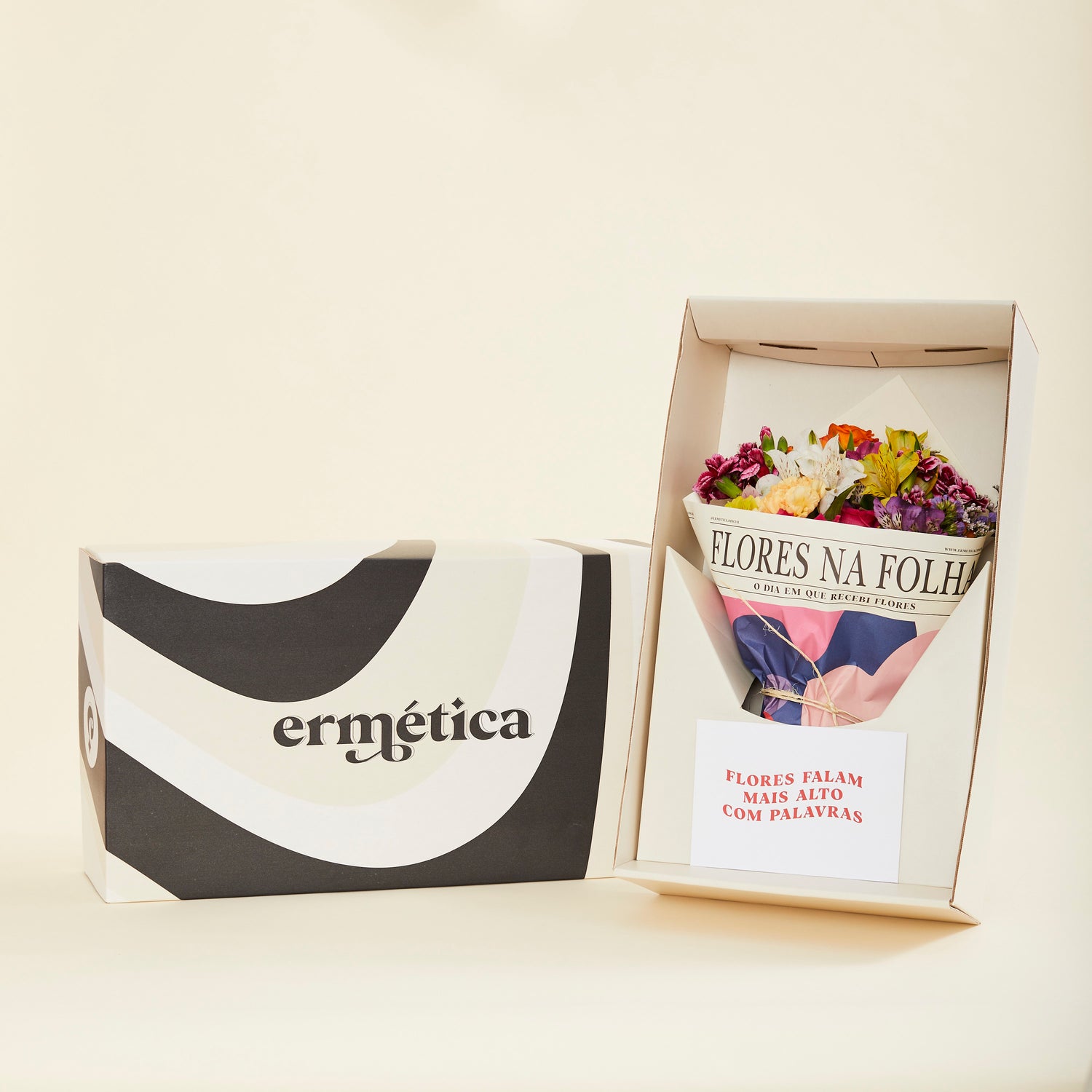 Aqui você não precisa perder seu tempo escolhendo a melhor opção de presente. Eu já fiz isso para você! Meu produto é assim: uma caixa com design inovador e colorido, com flores embaladas na folha de jornal.